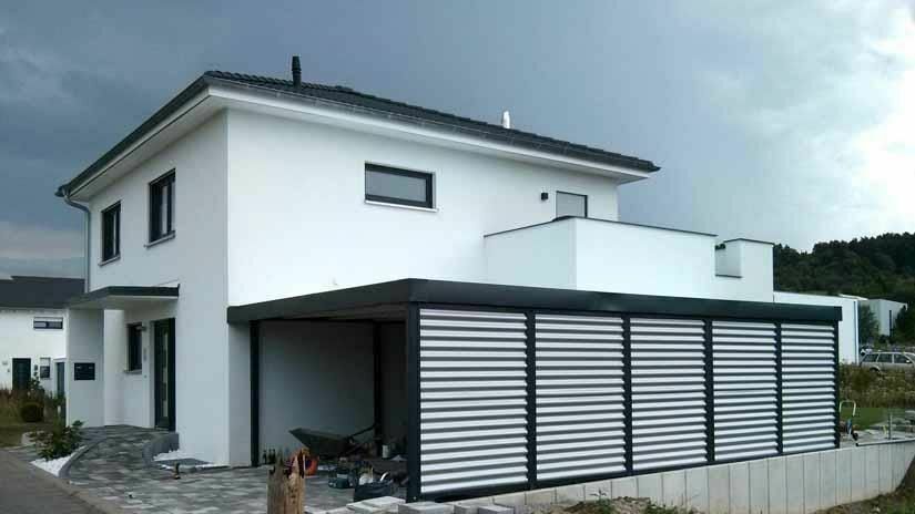 Carport - wiata garażowa na dwa stanowiska samochodoweStalowa konstrukcja zapewnia jej całkowitą stabilność w odróżnieniu od konstrukcji drewnianych.